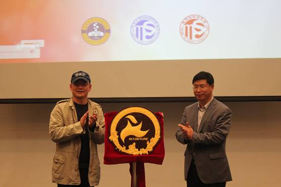 戴蓉宣布第二十届材富科技节暨研究生会学术论坛开幕,刘忠范和任晓杰一同为材富科技节会标揭幕。会标图案中,一只火烈鸟在镜月湖前腾空而起,象征材料学院不拘一格、敢于创新,力争在材料学研究领域再上新台阶的学术追求。
