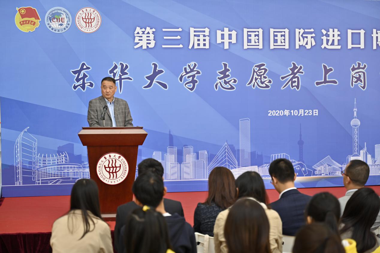 王云骏在讲话中充分肯定了各部门在疫情防控特殊时期为进博会志愿者工作所做的努力,并代表学校向为进博会辛勤付出的老师和同学们表示感谢。他寄语东华“小叶子”们要坚定理想信念,践行志愿精神,讲好进博故事,厚植家国情怀,成长为与国家一起前行的新时代青年;要锤炼过硬本领,以兼具理想抱负和求真务实的优秀品质,勇于担当作为,向世界展示东华青年爱国、自信、积极、开拓的品格,为第三届进博会实现“更新、更优、更快”贡献东华人的智慧与力量。同时希望相关职能部门坚持多元协同推进,凝聚志愿合力,在扎实开展进博会志愿服务工作中向世界、向祖国、向社会宣传东华价值,展示东华温度,彰显东华风采。