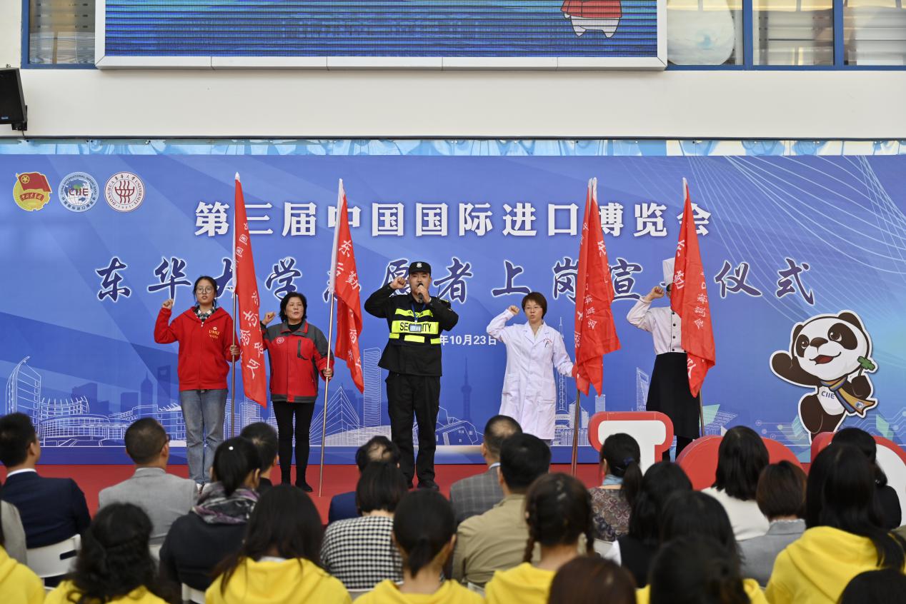 上岗宣誓仪式上,安保服务团队、食堂服务团队、宿舍管理服务团队、校医院保障团队、志愿者平方团队共同承诺全力以赴、助力进博;保障全体志愿者在疫情期间更好地服务进博;34名党员志愿者庄严宣誓,不忘初心、牢记使命,以实际行动发挥党员先锋模范作用,带领全体志愿者全身心奉献进博。